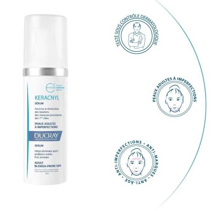 Le sérum KERACNYL est un soin quotidien anti-imperfections et anti-âge à destination des peaux à tendance acnéique de la femme adulte • Sa formule triple action favorise la disparition des boutons et des marques pigmentaires tout en limitant l’apparition des premières rides • Au fil de l’utilisation, la peau paraît plus lisse, plus nette et les imperfections s’atténuent• Excellente base de maquillage pour les peaux adultes sujettes aux imperfections